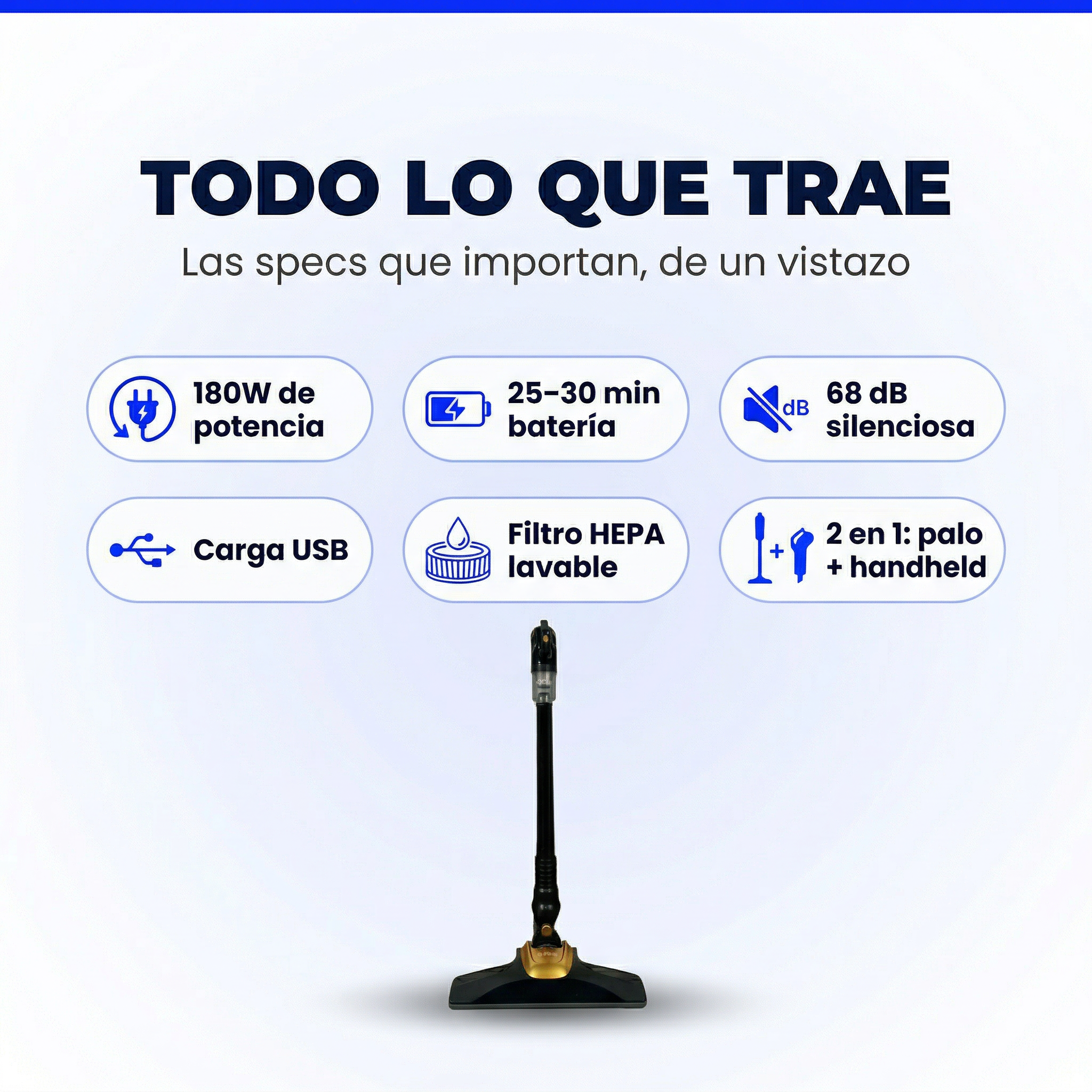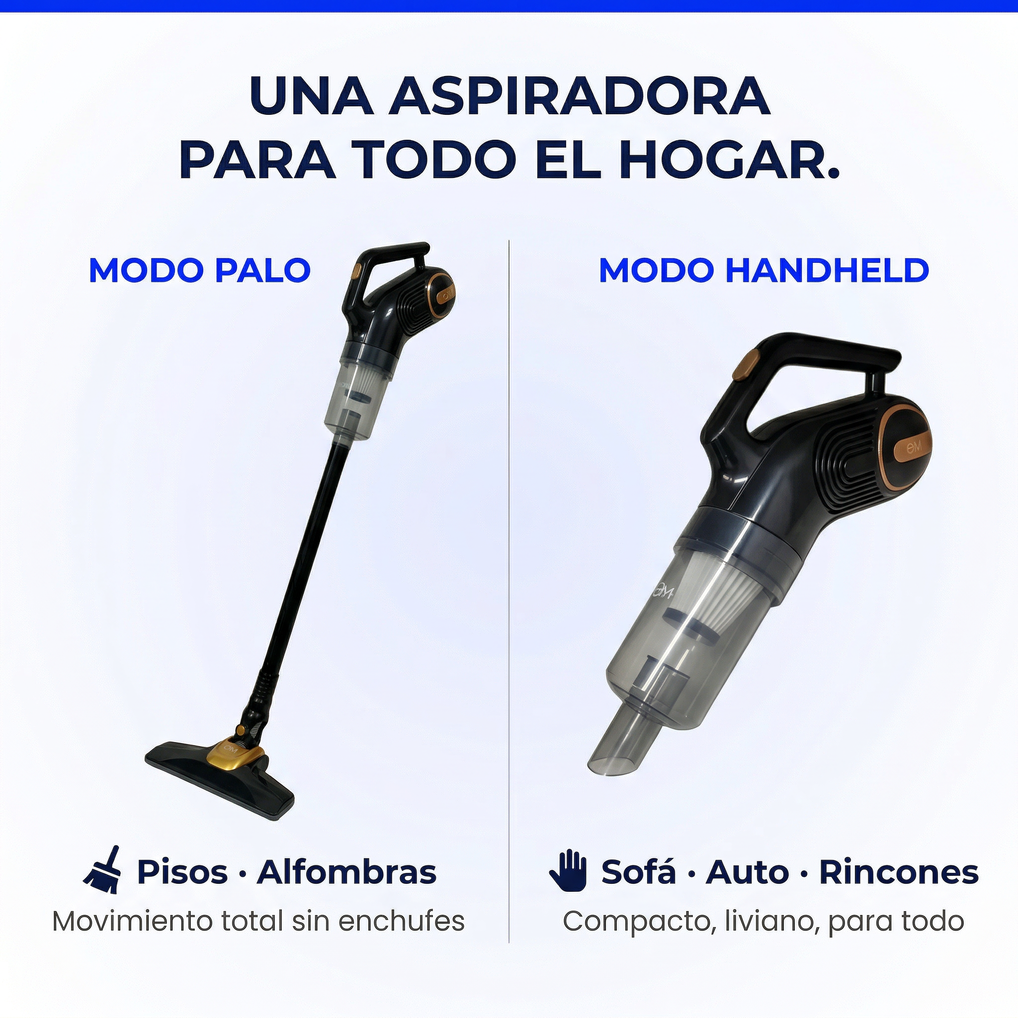 | Modo Handheld | Sofá, auto, escaleras, rincones | Compacto y liviano — llegás a donde no llega el palo |