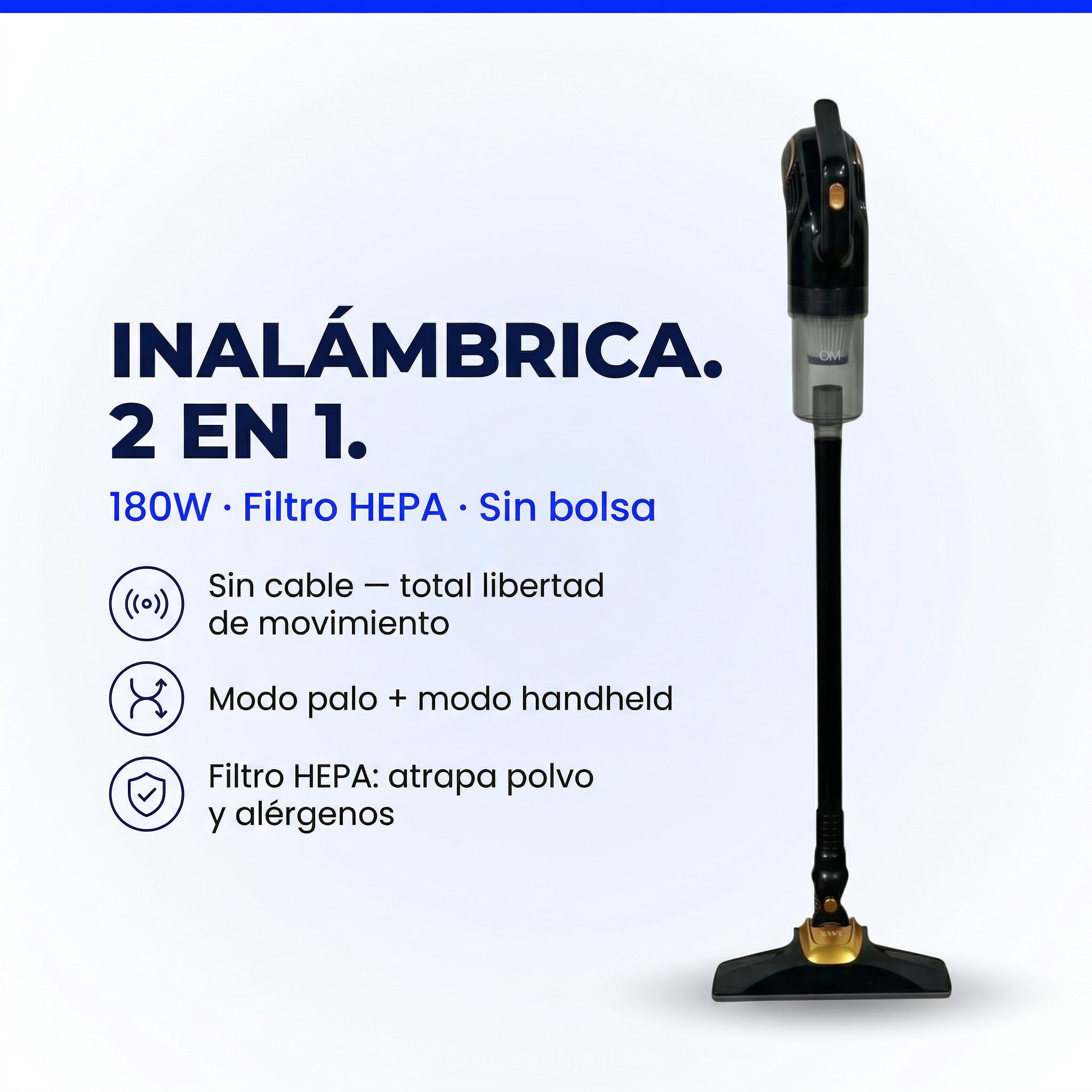 La OM-VC-27 tiene sistema ciclónico y filtro HEPA lavable que retiene el 99,97% de partículas finas: polvo, ácaros y alérgenos.