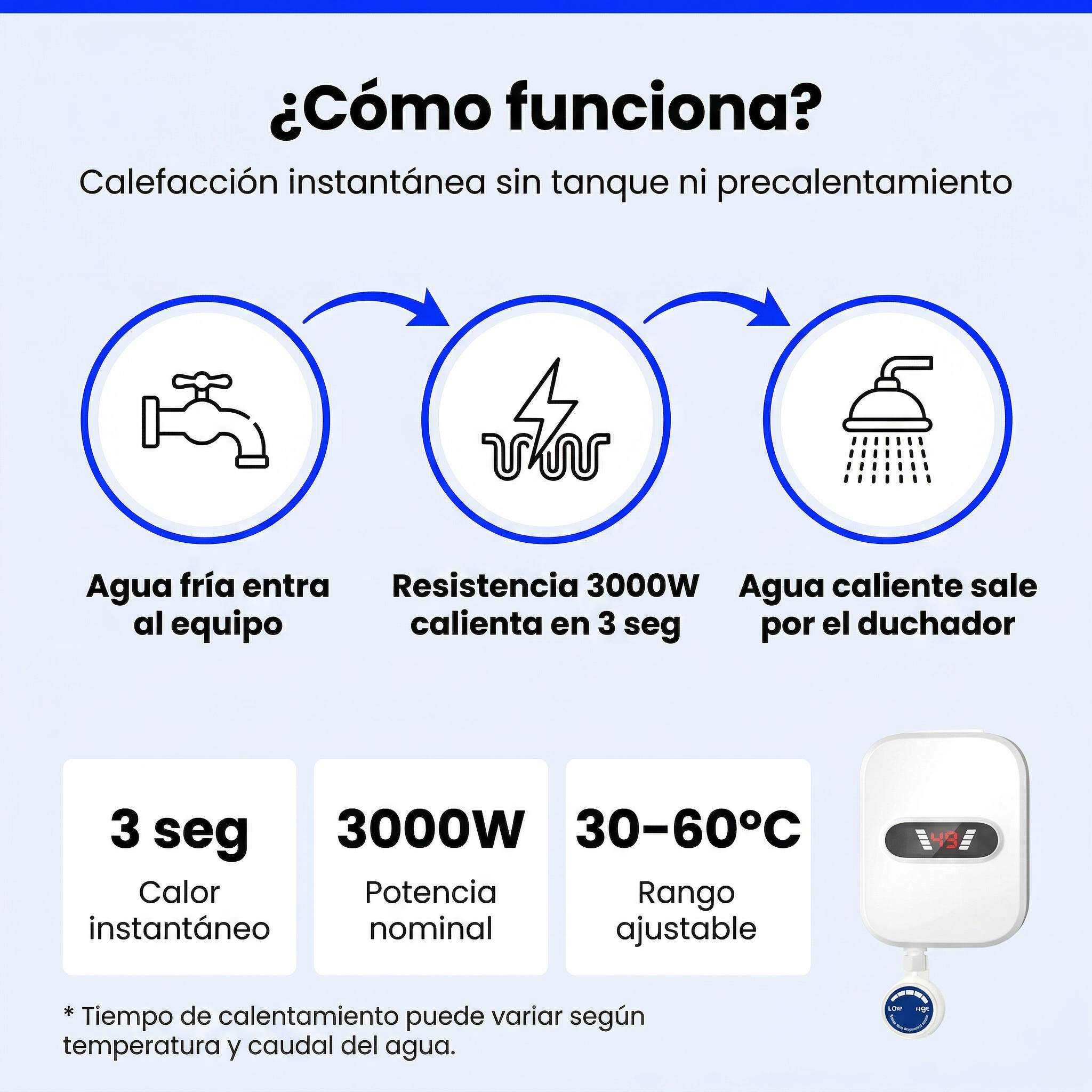 Tiempo de calentamiento puede variar según temperatura y caudal del agua.