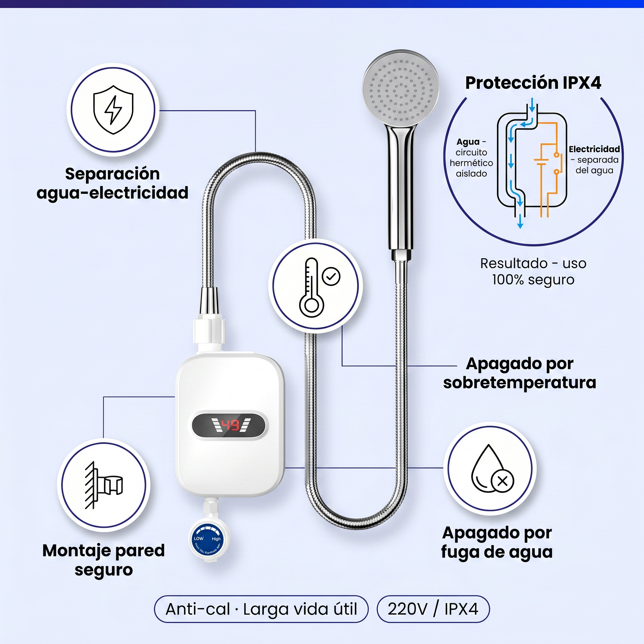 💧 IPX4 — Separación agua-electricidad para uso seguro