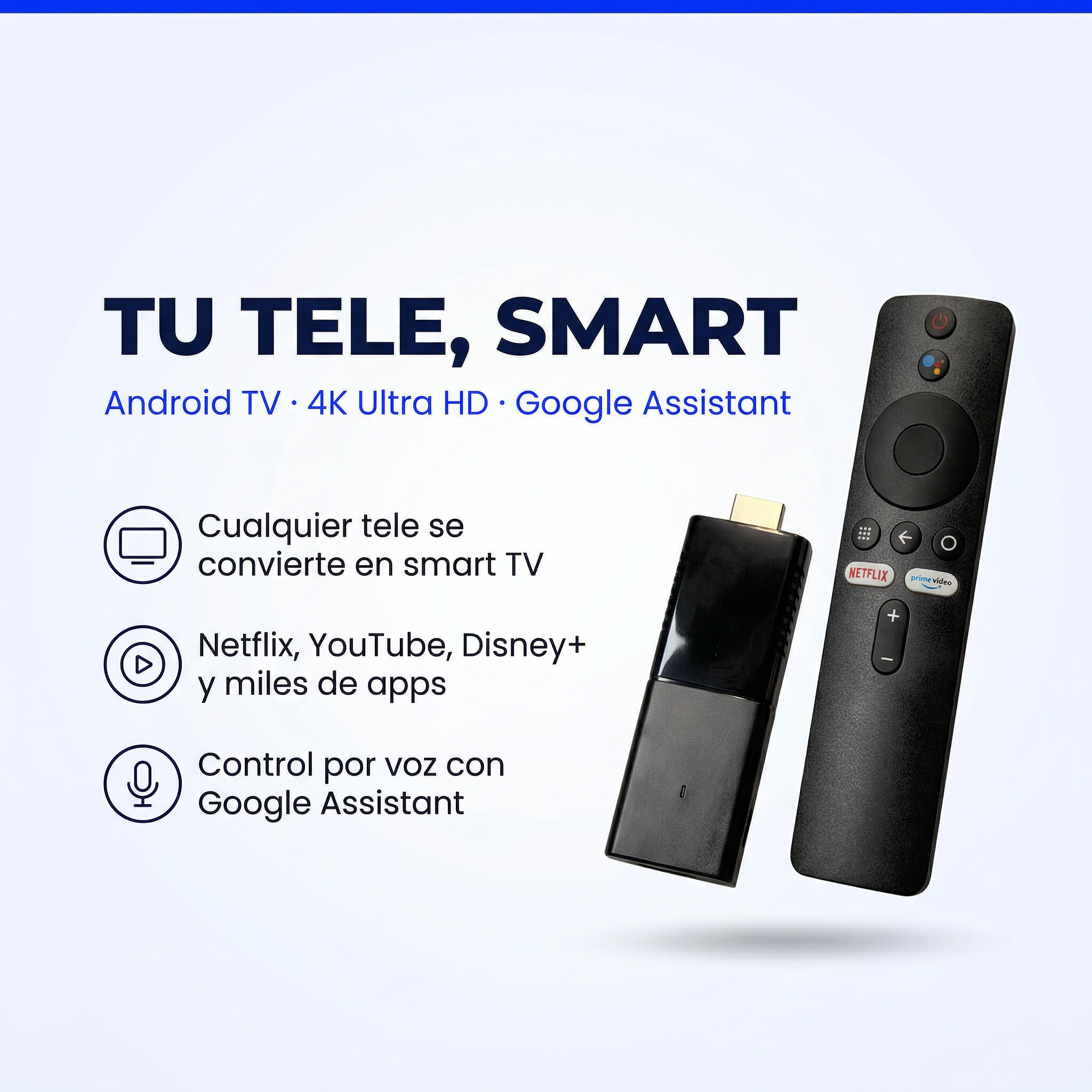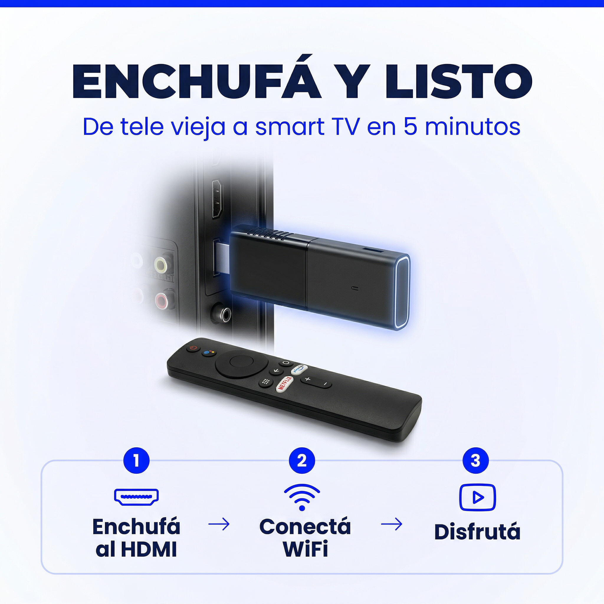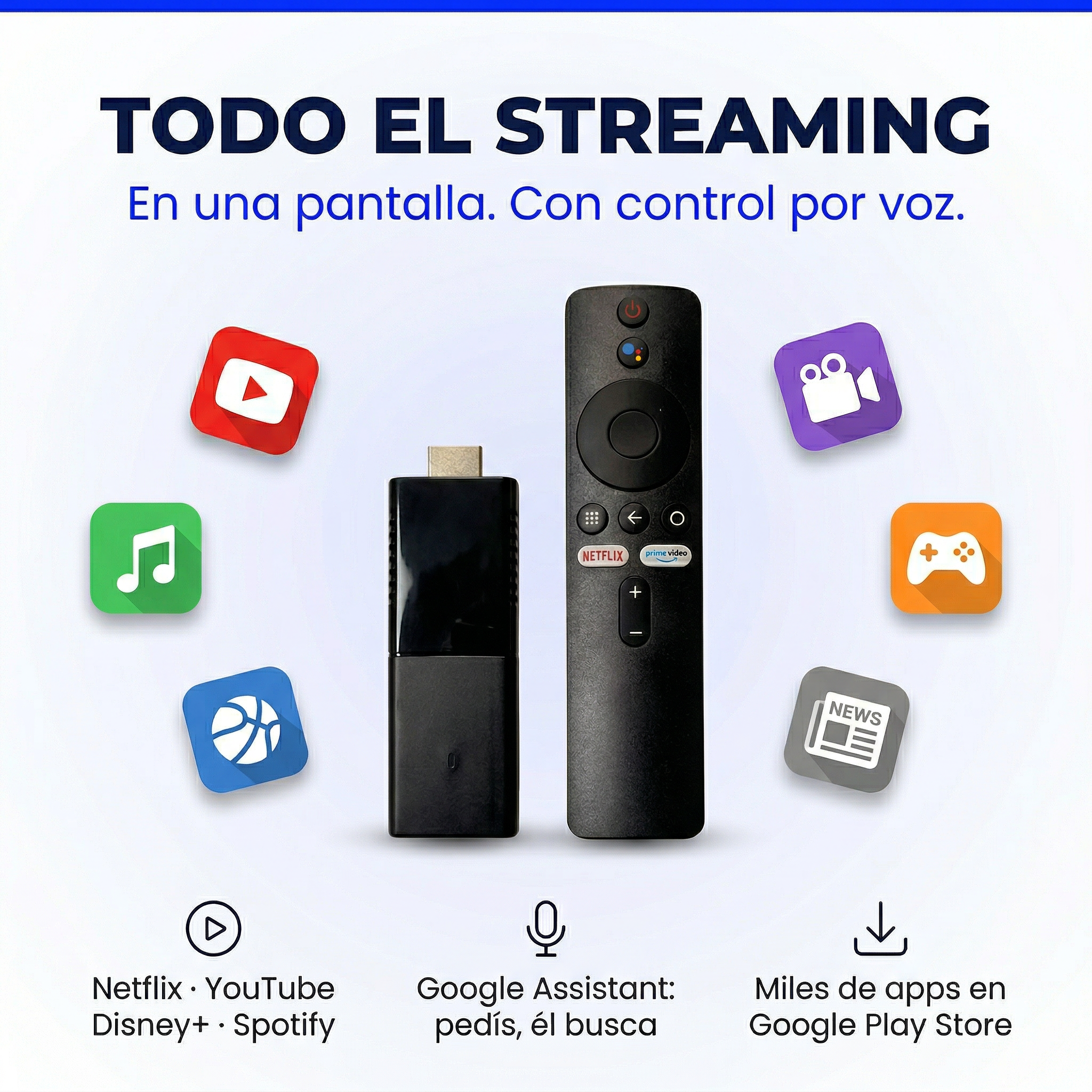 Enchufás al HDMI, conectás el WiFi y en minutos tenés Netflix, YouTube, Disney+, Google Assistant y miles de apps. Sin cambiar la tele. Sin complicaciones.