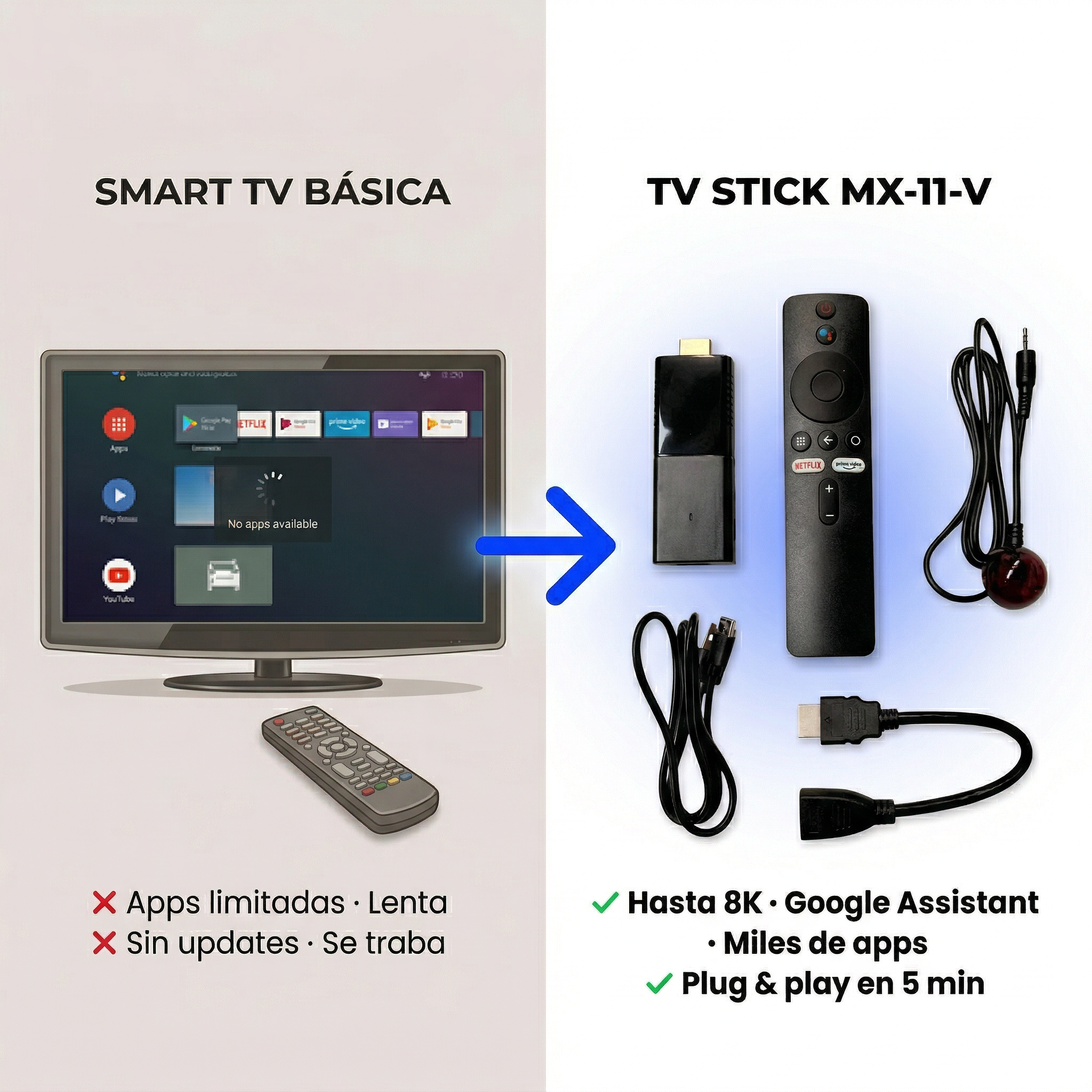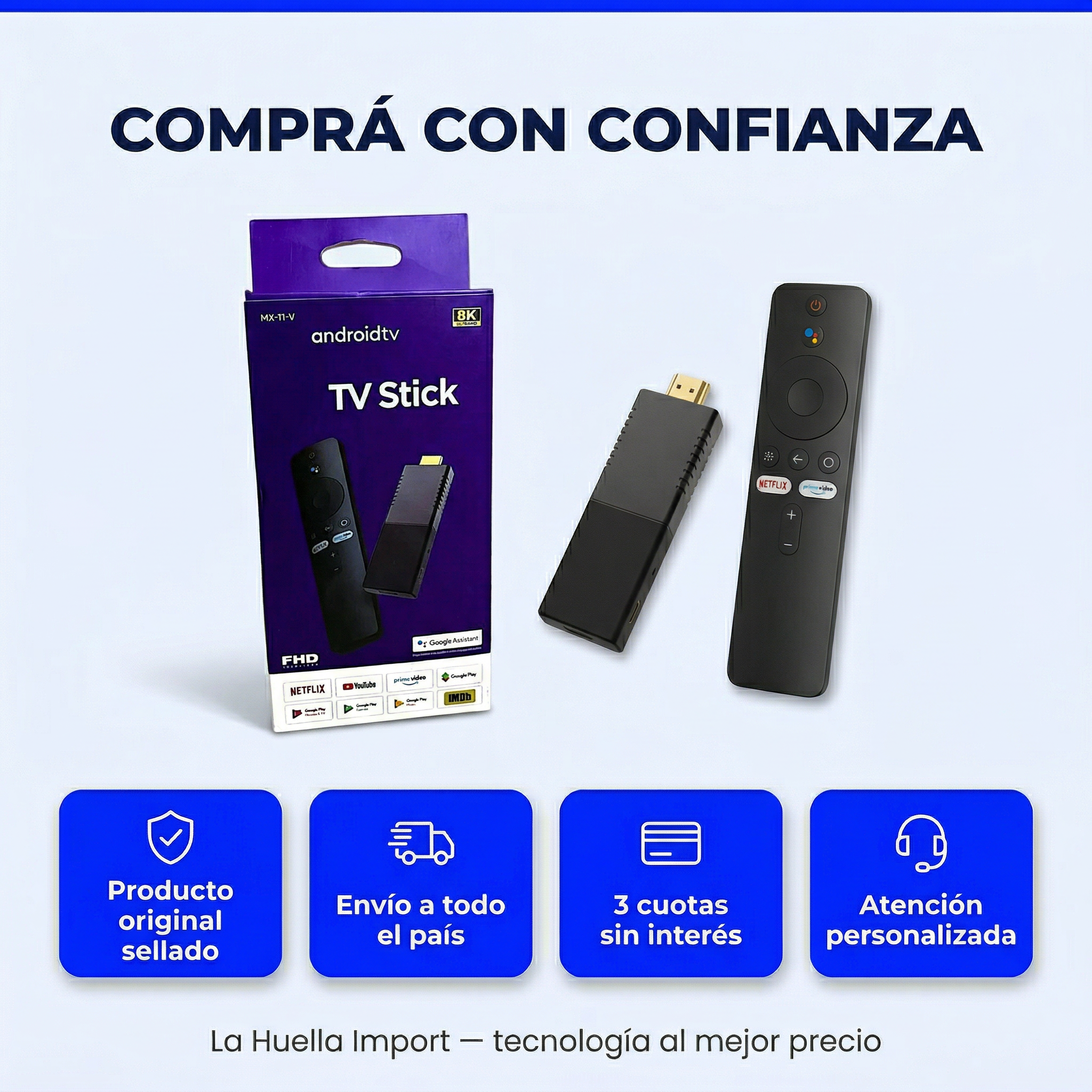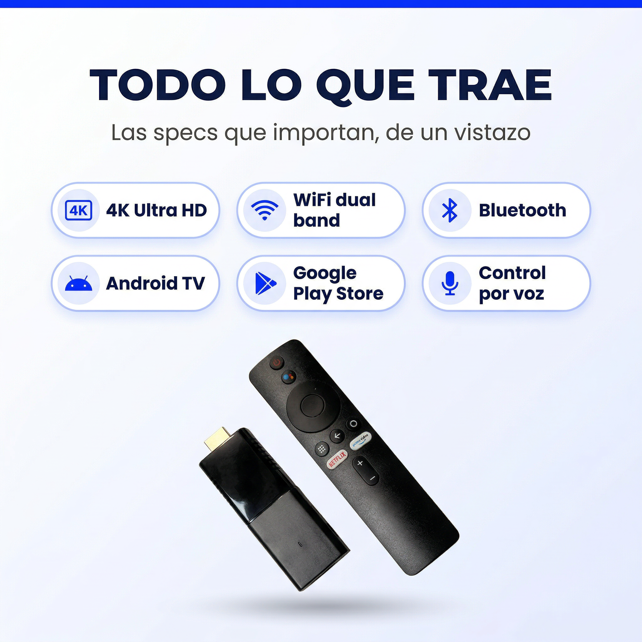 Enchufás al HDMI, conectás el WiFi y en minutos tenés Netflix, YouTube, Disney+, Google Assistant y miles de apps. Sin cambiar la tele. Sin complicaciones.